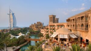 Now this one is special for a very different reason. In a city filled with glass towers and constant construction noise, Madinat Jumeirah Living offers something rare, calm, charm, and character. The whole project sits just across from the Burj Al Arab, yet it manages to feel almost village-like. Think winding paths, shaded courtyards, and buildings that actually look like they belong in the region.
